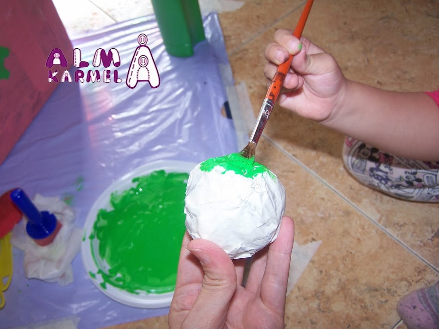Una vez seca, cogimos las brochas con formas y lo adornó. Aunque en la parte verde, que es la de abajo, decidió hacerle dibujitos con los rotuladores.