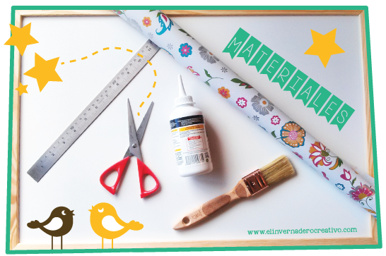 Lo más importante es un papel para forrar el marco de la pizarra. Yo he escogido este papel de regalo pero el diseño es cosa vuestra, ya sabéis que hay papeles muy bonitos en las tiendas craft. Necesitaremos también cola blanca de carpintero, un pincel o brocha, tijeras y una regla.