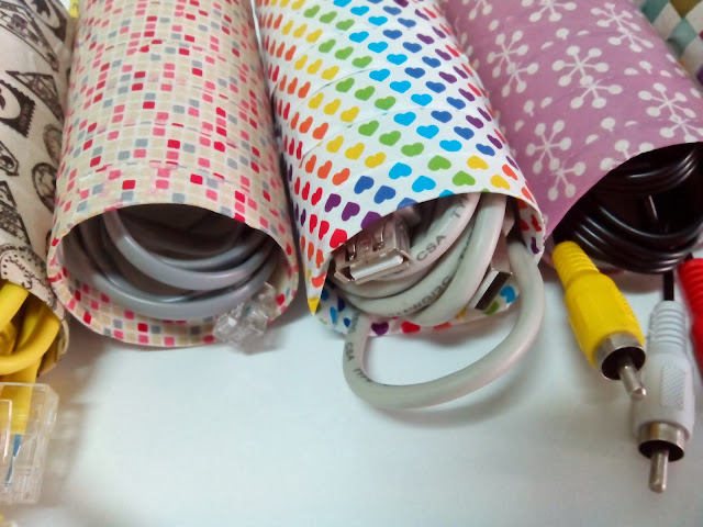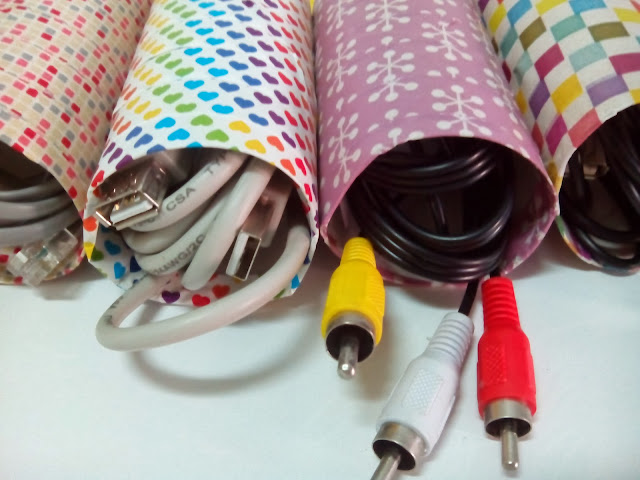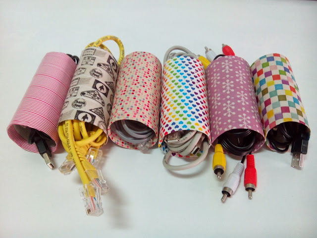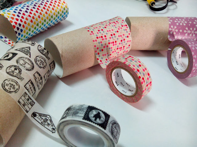 Tan sencillo como envolver los tubos con los washis, (o bien forrarlos con el papel decorativo).