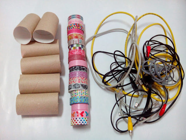 Bueno, necesitamos unos cables, rollitos de cartón que podemos sacar del papel higiénico, de ahí que necesitemos dejar pasar unos días... y unos washis, (o bien papel decorativo...).