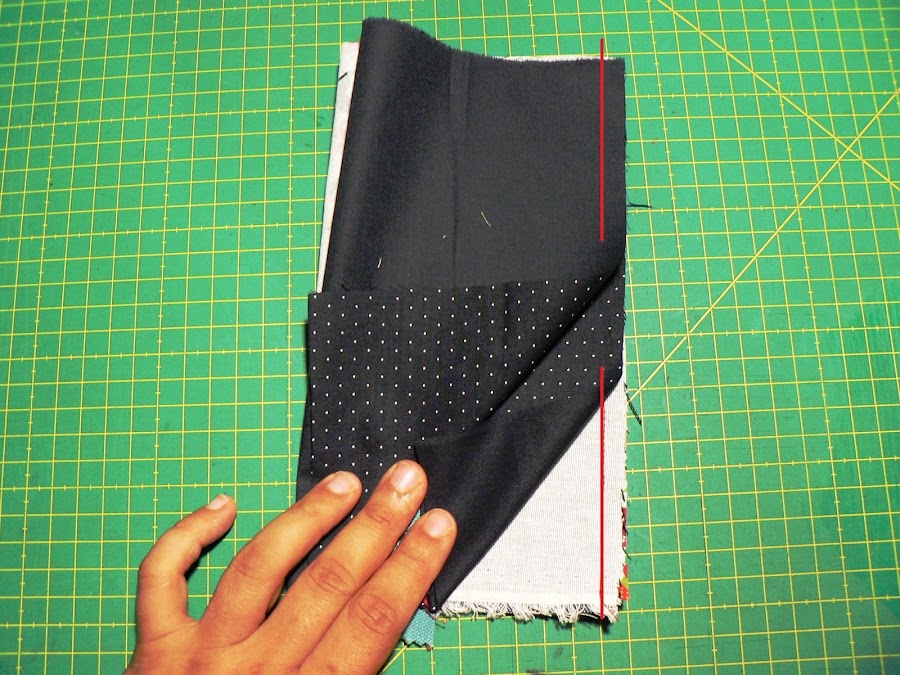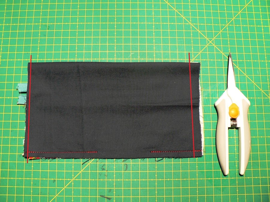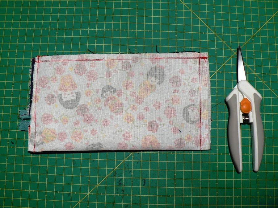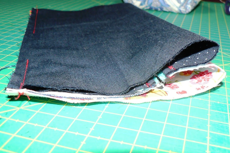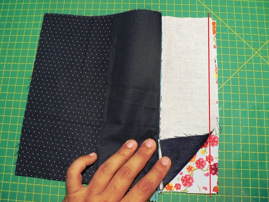 Ahora cerraremos el estuche. Primero ponemos las partes inferiores de las telas exteriores juntas, derecho con derecho y cosemos un pespunte recto.