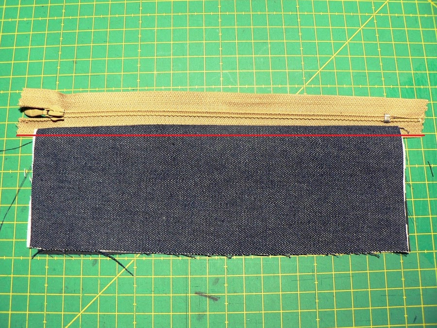Empezaremos cosiendo la cremallera a la parte inferior del estuche. Para ello colocamos la tela exterior hacia arriba, la cremallera con el carro hacia abajo en la parte superior de la tela y la tela de forro encima con el derecho hacia abajo. Cosemos un pespunte recto por la línea superior.