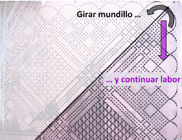 Así que una vez trabajada la labor hasta la diagonal y girado el mundillo 90º hacia la izquierda, entonces y sólo entonces podremos seguir trabajando como siempre de derecha a izquierda y de arriba hacia abajo siempre que tengamos bolillos por la derecha que alimenten la labor.