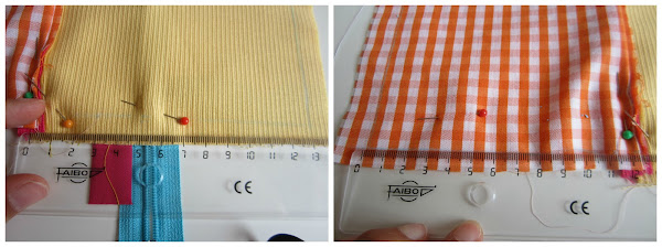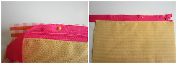 Teniendo la precaución de doblar bien la zona de la cremallera como veis en la foto, y sujetamos todo con alfileres?