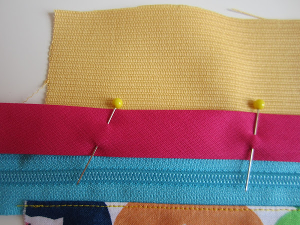 Colocamos la cinta al bies encima, de modo que tape un trozo de la cremallera. Sujetamos con alfileres y cosemos dos pespuntes encima del bies, uno en el lateral inferior y otro en el superior?