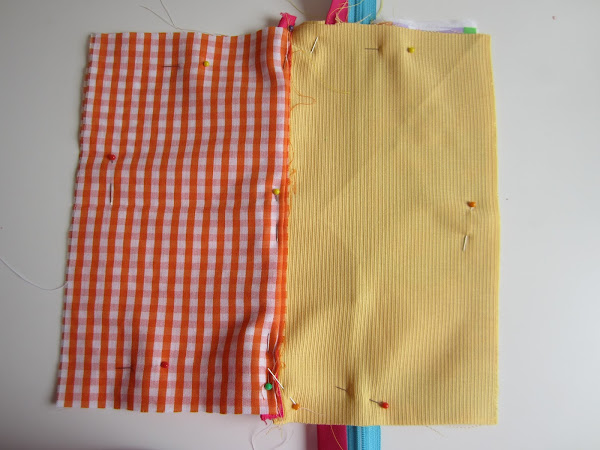 Ahora ya podemos coser el bolsillo a la parte delantera del estuche. Para ello colocamos una de las telas del exterior del estuche (amarilla) por la parte del derecho y el bolsillo encima también del derecho. Lo ajustamos en la parte inferior y lo sujetamos con alfileres.