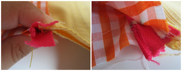 - Dos rectángulos de tela para el interior (en mi caso Vichy en cuadros naranjas) de 25x16 cm.