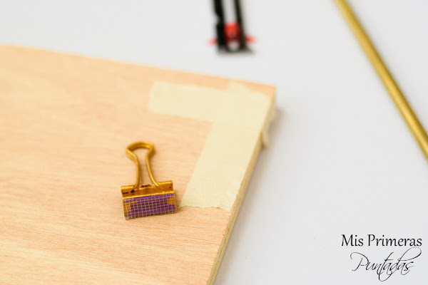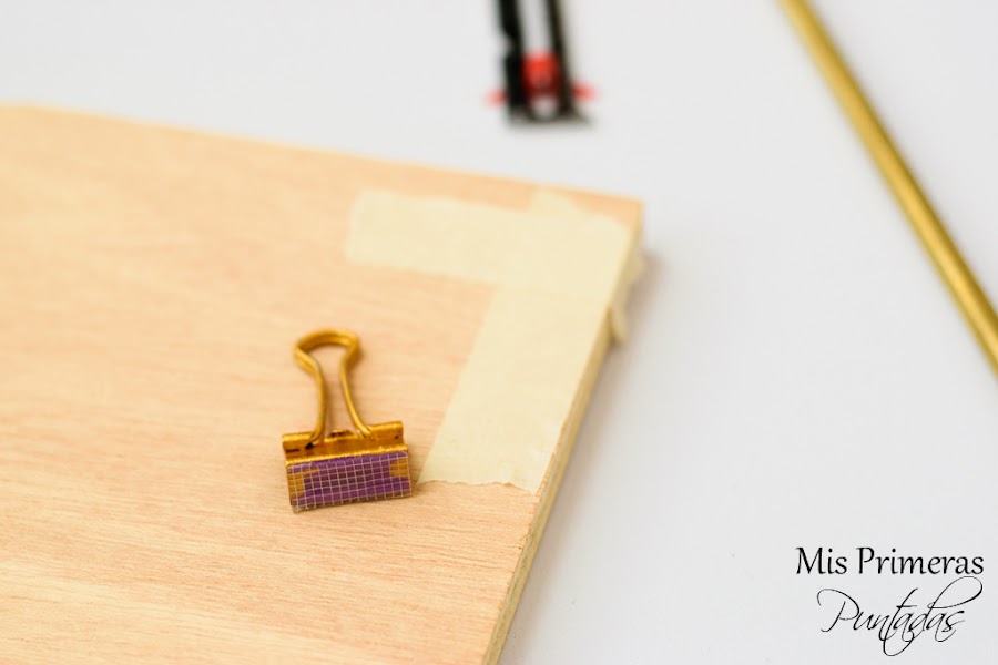 Luego, sobre la madera marqué la posición donde iba a colocar cada uno de los clips (a mí me resultó más cómodo marcarlo con la ayuda de un poco de cinta de carrocero).