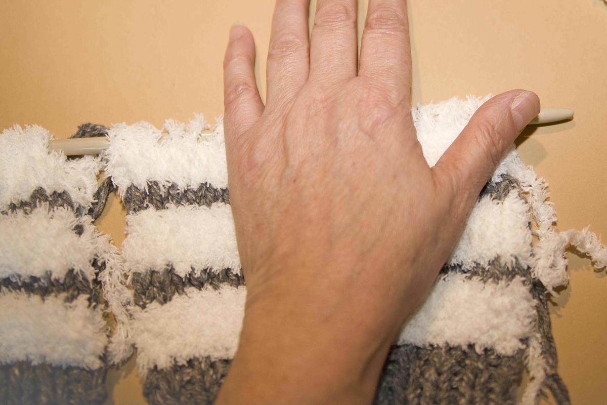 Seguimos alternando las lanas blanca y gris hasta que alcanzamos la altura de nuestra mano desde la muñeca a la base de los dedos.