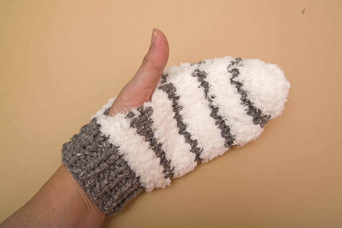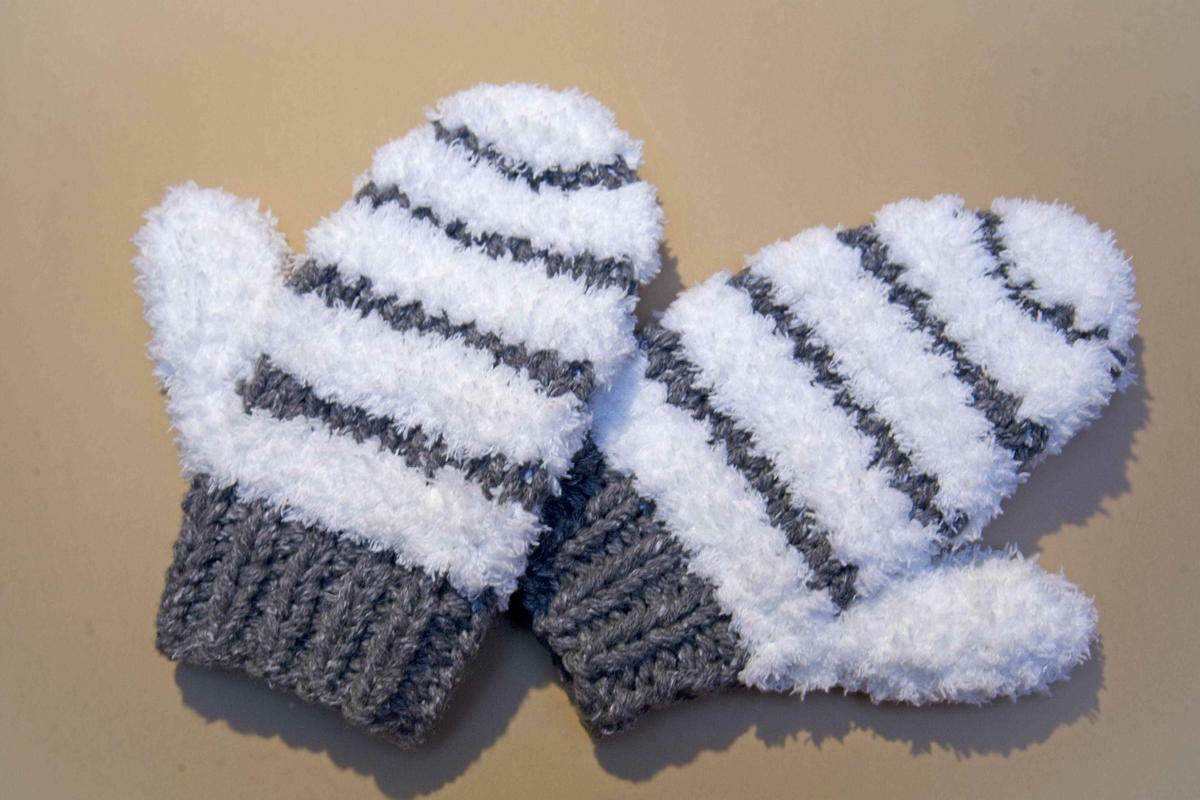 Tejer las dos manoplas a la vez es muy práctico, puede que a veces se enreden un poco las lanas, pero te evitas tener que andar contando vueltas y puntos para que te queden las dos iguales.