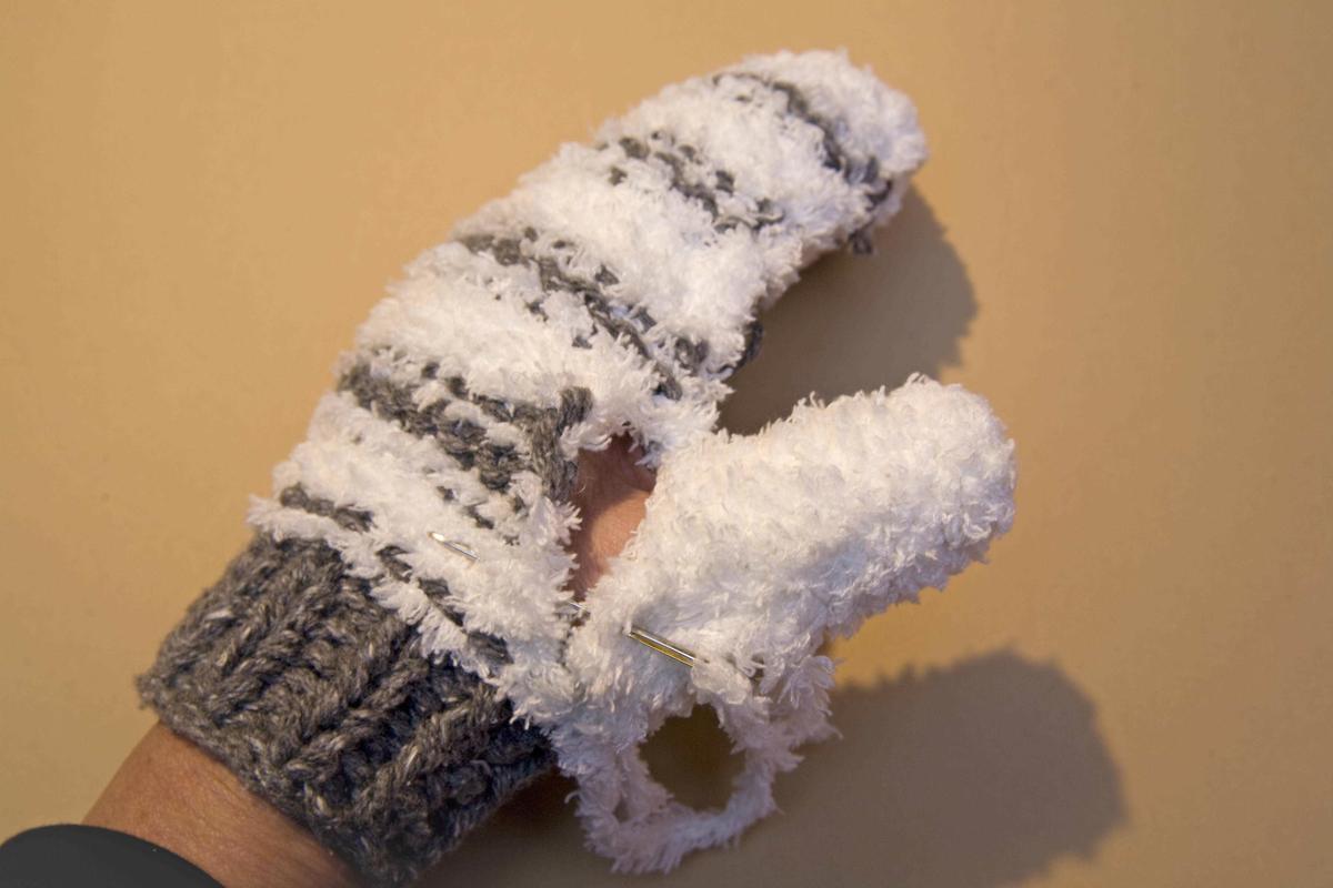 Tejemos varias vueltas con estos nueve puntos hasta que la altura cubra nuestro dedo pulgar y cerramos y cosemos de la misma manera que hemos hecho con la manopla.