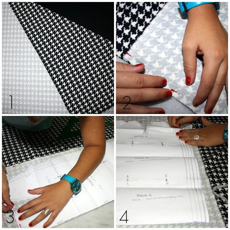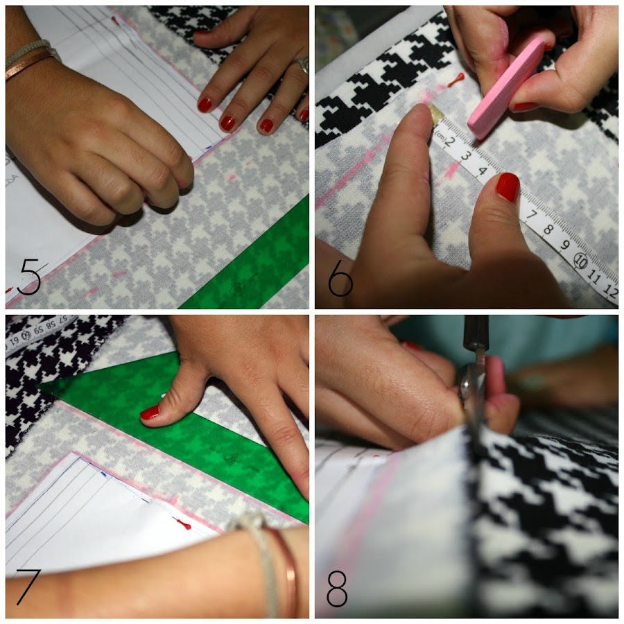 6: Cuando tenemos pintado el patrón con el jaboncillo, medimos 3 cm desde la linea que marcamos anteriormente al rededor del patrón y lo señalamos. Esto lo hacemos por todos los lados, es lo que nos servirá para el dobladillo, la cinturilla y para las costuras.
