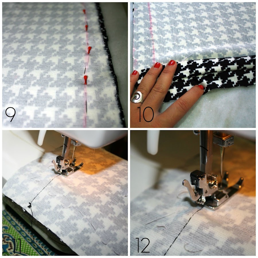 9: Quitamos el patrón y afianzamos con alfileres en la linea que hemos dibujado. Señalamos con un hilván muy flojo para no perdernos y cuando lo tenemos, cortamos el hilo para poder abrirlo por la mitad y después unirla con la otra parte.