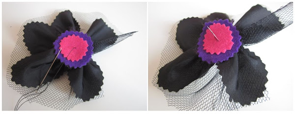 Sobreponéis un círculo de fieltro sobre otro y los coséis sobre la flor de tul. Este paso además os servirá para esconder la puntada de coser la flor al sombrero.