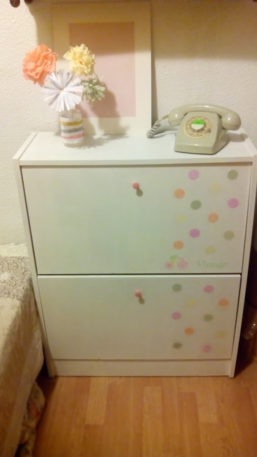 Yo lo puse sobre un zapatero que tengo en uno de los dormitorios, si, el zapatero esta redecorado por mi misma... era de color madera natural y ahora luce así... me disculpareis por la calidad de la foto, en esa habitación no entra luz natural y la lámpara... bueno, ya lo veis...