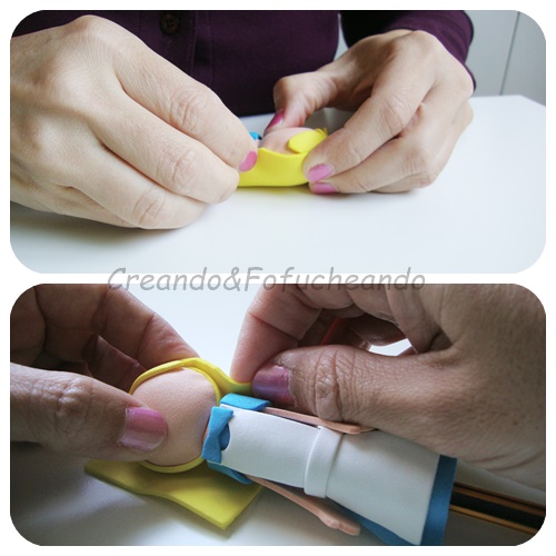 Le colocamos también una mini pieza en forma de pajarita,que vendría a ser el cuello del vestido, y dos mini piezas en azul también,con forma de semicírculo para las mangas.