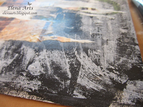 Sobre la base de papel blanco de acuarela o, en mi caso yo cojí el papel de 200 gr, pintamos una parte de la hoja con pintura acrílica de color negro. Una vez seco, cogemos el geso transparente (se puede sustituir por una cola para decopatch) y pegamos nuestra chica encima de nuestra base. Esperamos un minuto y antes de que se seque por completo vamos arrancando algunas partes de papel creando este efecto de desgarro como veis abajo. De ese modo aparece el color negro por debajo, dando a nuestró fondo un efecto muy interesante. Una vez conseguimos el resultado deseado, cubrimos de nuevo todo con el geso transparente para que todo quede bien pegado, unificado y protegido.