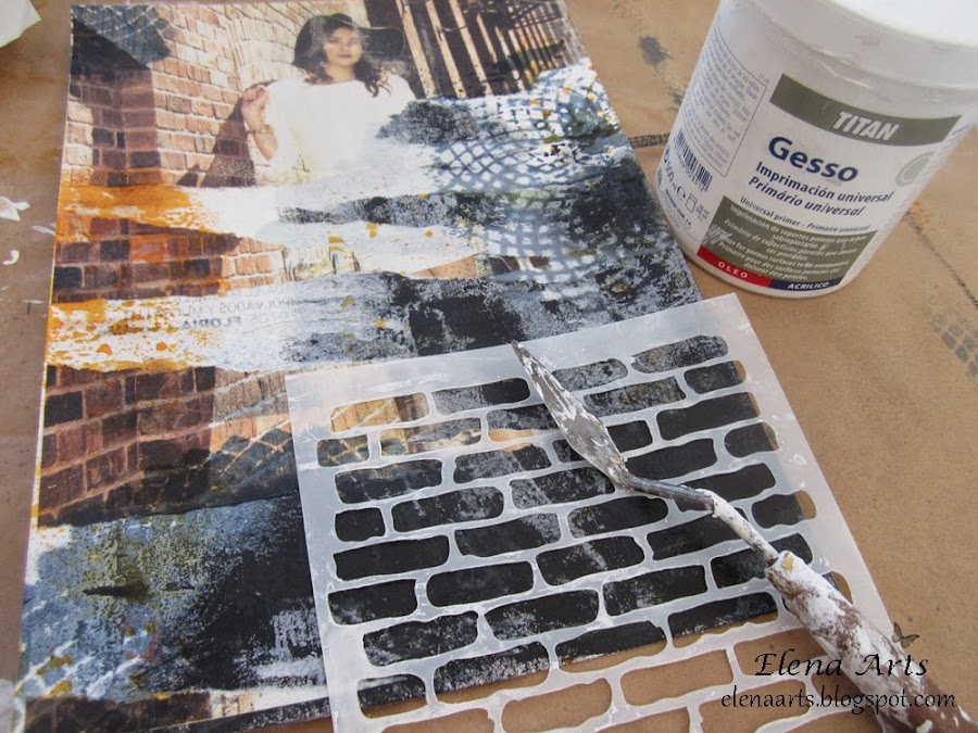 IMPORTANTE! Siempre esperaremos que se seque cada capa que demos, antes de seguir con otro paso. Ahora aplicamos gesso blanco usando la plantilla de ladrillos.