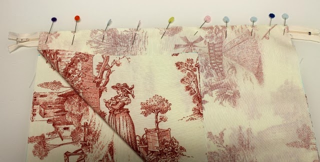 Ahora colocamos la tela a boca abajo sobre la cremallera (ver foto), comprobar que esté alineada con la tela de abajo. Aseguramos con alfileres y pasamos un pespunte.