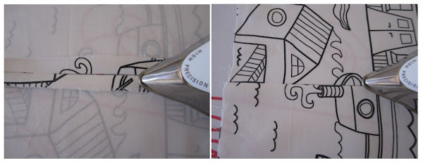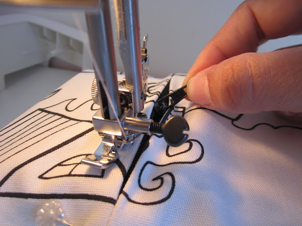 Antes de llegar al final hay que tener la precaución de abrir la cremallera, para que no nos moleste al coser este último tramo. Para ello levantamos la patilla, dejando siempre la aguja clavada, y con cuidadín abrimos la cremallera, volvemos a bajar la patilla y seguimos cosiendo.