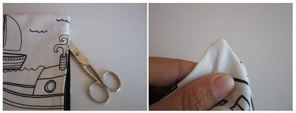 ¡¡Ya lo tenemos casi listo!! Solo nos falta darle un corte a las esquinas como se muestra en la foto, para que a la hora de darle la vuelta a la funda nos quede bien las puntas.