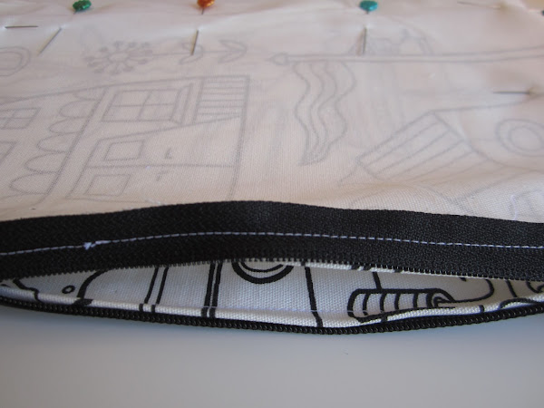 Y vamos sujetando con alfileres la cremallera de modo que quede bien alineada y centrada y a su vez escondida debajo de la tela. Es un poco complicado de explicar pero en la foto se ve muy sencillo.