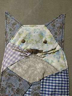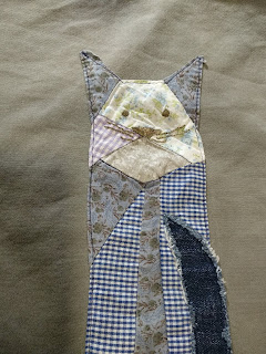 Aquí se puede ver el detalle de la cabeza del gato, los ojos, la nariz y los bigotes están bordados a mano con hilo torzal de color verde oliva. Los bordados han de tener un color que destaque del fondo y a juego con las telas que hemos utilizado.