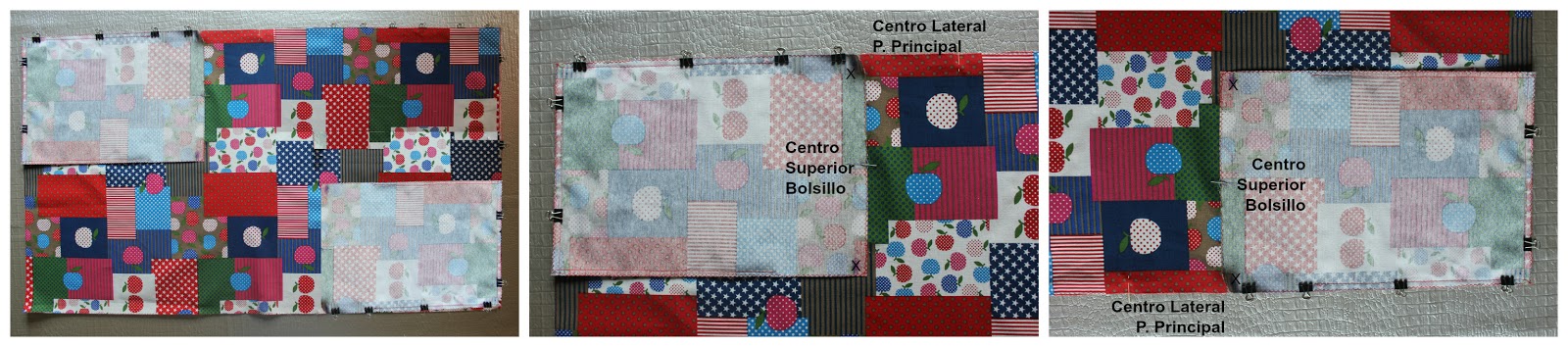 -las dos intersecciones de 0,5" de costura en el revés del borde superior de cada lateral y el centro del mismo borde.