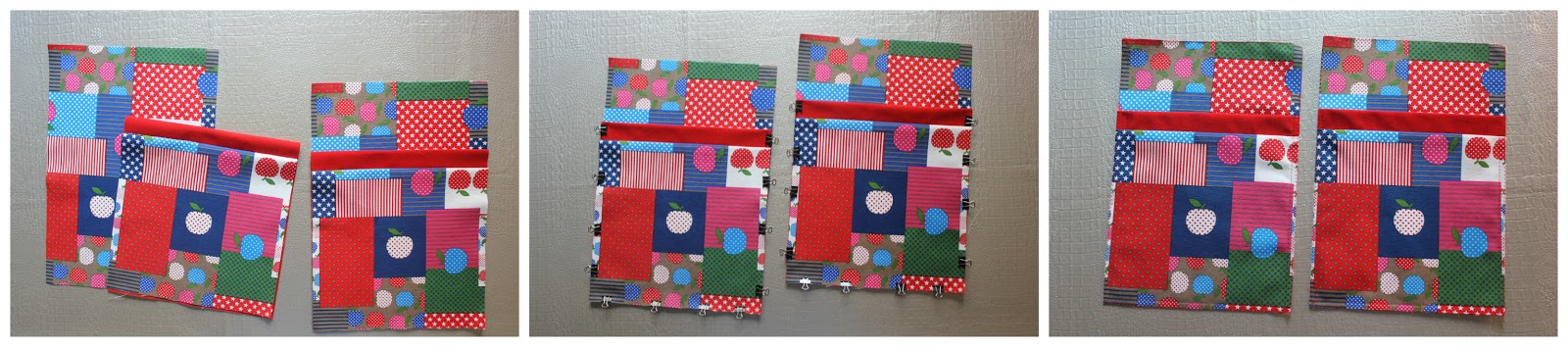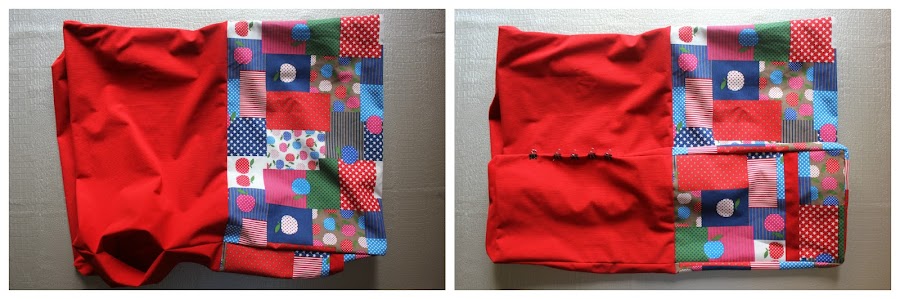 Colocar los derechos de ambos laterales sobre el derecho de la tela exterior de la pieza principal (alineando los bordes pequeños) y sujetar con alfileres o con clips de presión.