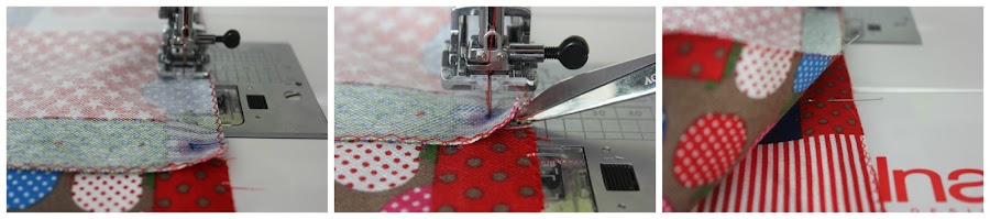 Girar el lateral a 90 grados (de tal manera que el centro del lateral coincida con el centro de la pieza principal) y seguir cosiendo hasta la segunda marca de intersección 1/2", cortar y coser hasta la parte baja.