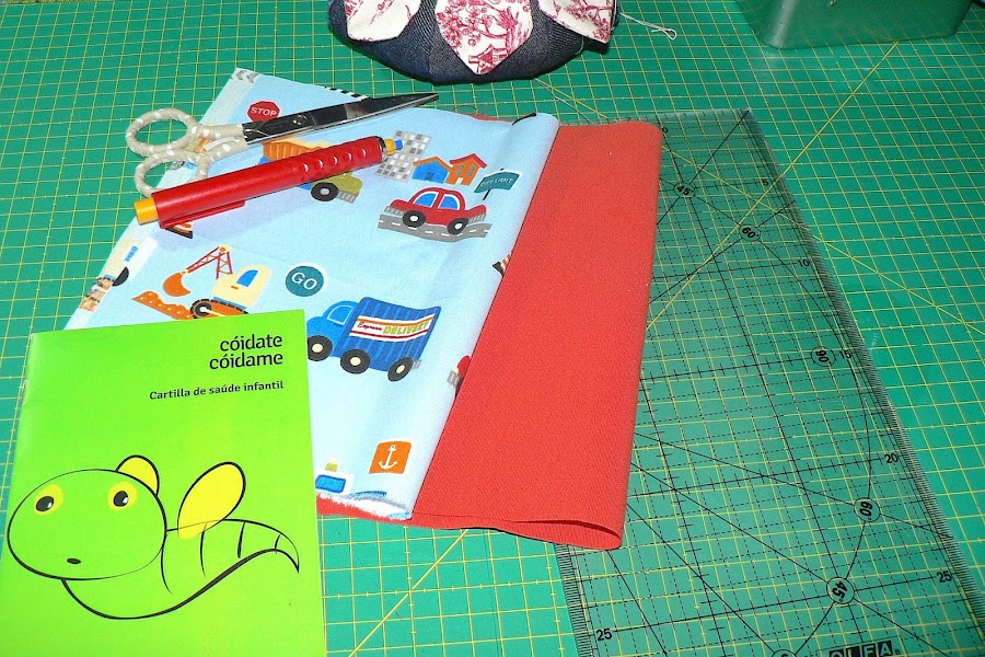 Lo primero decirte que no tengo ni idea de si las cartillas tienen un tamaño estándar en todo el país. Las que tenemos en Galicia miden 16x11.5 cm. Ten esto en cuenta. Si tu cartilla tiene otras medidas vas a tener que agrandar o empequeñecer los trozos de tela tantos centímetros como necesites.