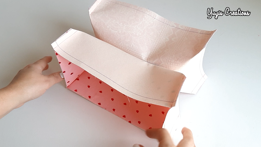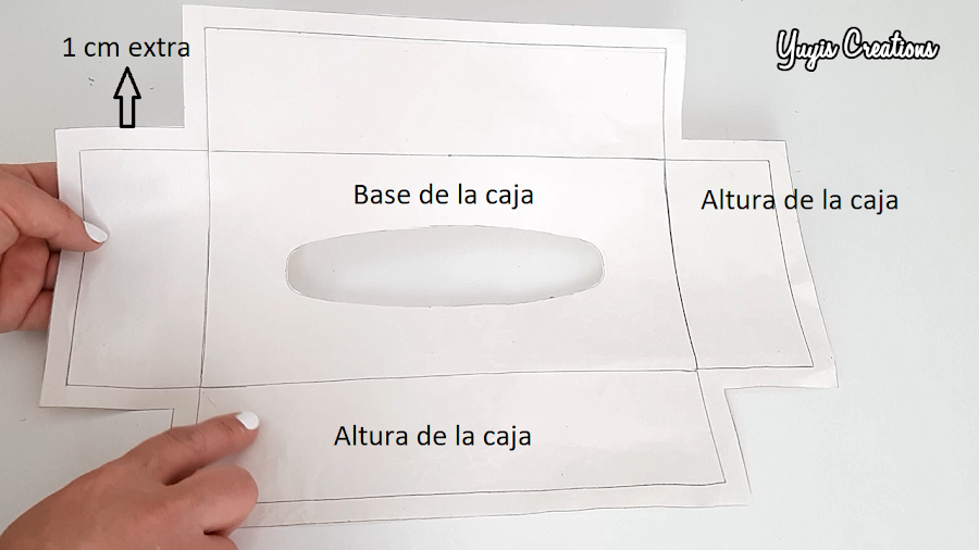 Como ves en la imagen de arriba, dibujamos el contorno de la caja como base. Medimos la altura de la caja y lo dibujamos en todos sus lados y le sumamos 1 cm que será el margen de la costura.