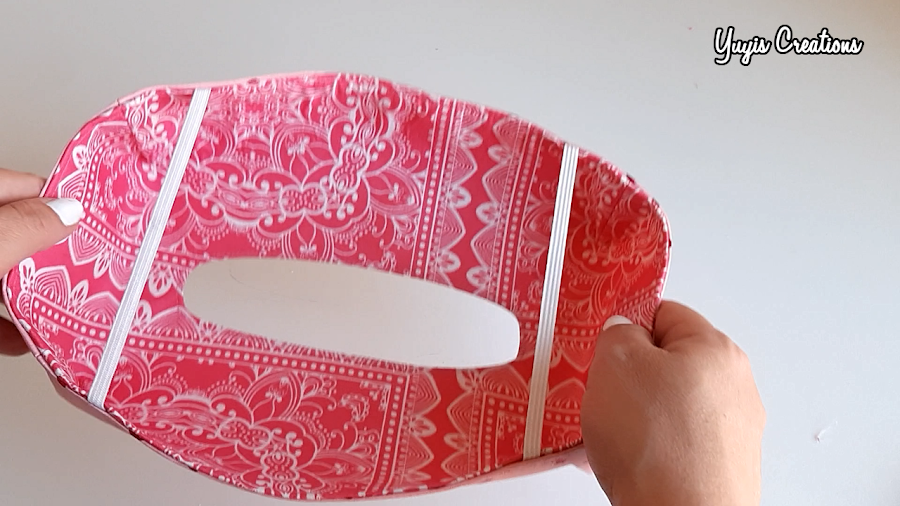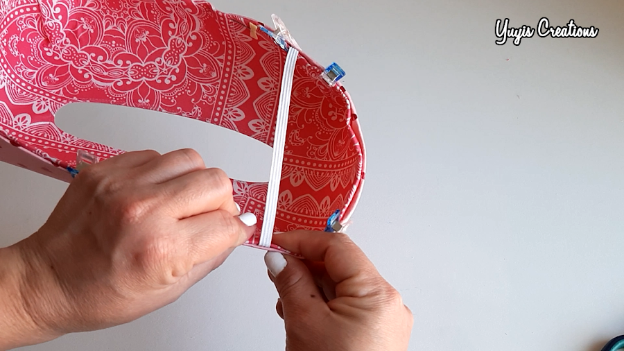 Yo he usado 2 trocitos de cinta de 15 cm cada uno y he metido un par de centímetros en medio de las telas al momento de coserla. Y hacemos lo mismo con el otro trocito de cinta elástica.