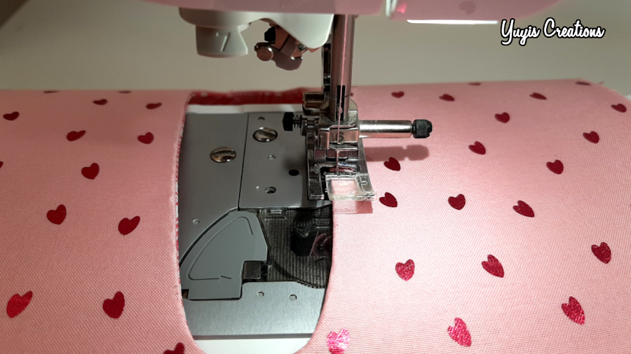 La cinta elástica la vamos a ubicar a 3 cm de las esquinas, por lo tanto cuando lleguemos a esa altura, debemos meter la cinta elástica en medio de las telas y cosemos por encima haciendo algunas puntadas de refuerzo.