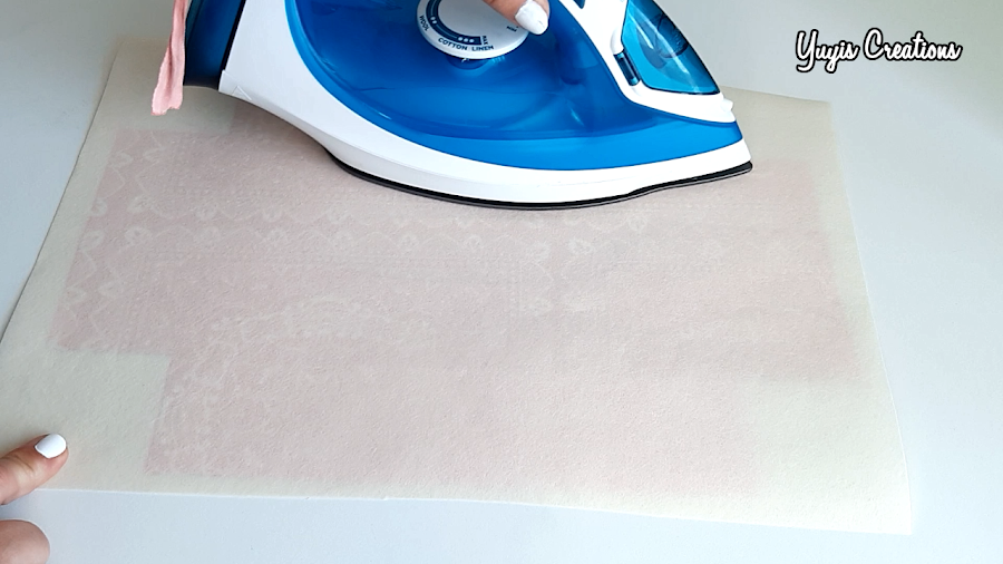 Después que hayas sacado el patrón, vamos a usarlo para cortar las telas. Vamos a necesitar dos piezas pero sin cortar el agujero central. Luego vamos a pegar la entretela con la plancha, llevando la parte del pegamento hacia el revés de la tela. Puedes poner entretela a 1 ó a ambas piezas de tela. Yo pondré entretela a ambas piezas.