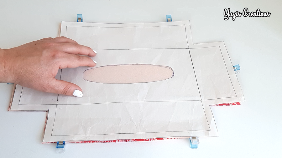 Cortamos el sobrante de entretela y juntamos las piezas de tela enfrentando sus derechos y usamos nuevamente el patrón para marcar el agujero central, de esta manera: