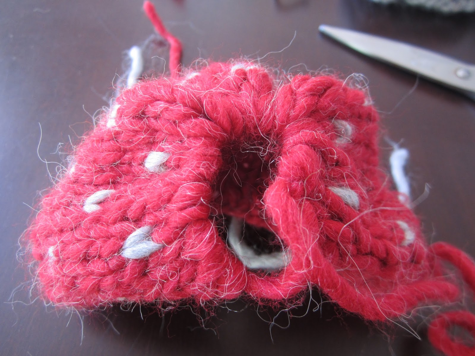 Darle la vuelta al gorrito y por el revés dar unas puntadas sobre la parte central para sujetarlo bien, a una parte y otra del agujerito.
