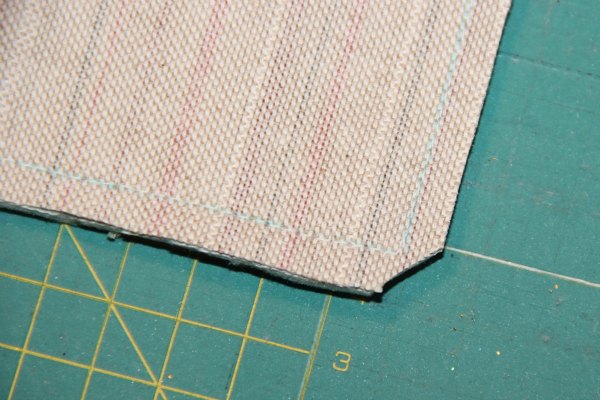 Una vez cosido, cortamos las esquinas y damos la vuelta a las telas.
