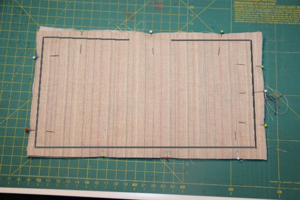 Por último colocaremos la tela principal con el derecho hacia abajo. Los derechos de las dos telas tienen que quedar enfrentados.
