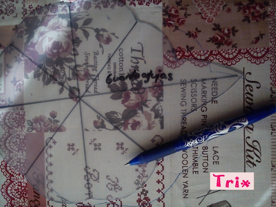 Lo pasaremos a acetato, el plástico que usamos para las plantillas y lo dibujaremos por el derecho de la tela exterior con bolígrafo del que se borra al planchar.