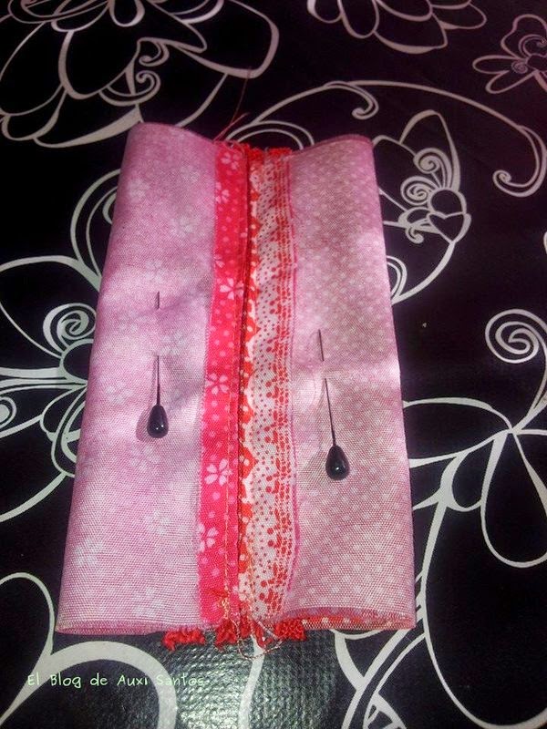 damos la vuelta a la tela y unimos por la mitad y sujetamos con alfileres para que no se mueva
