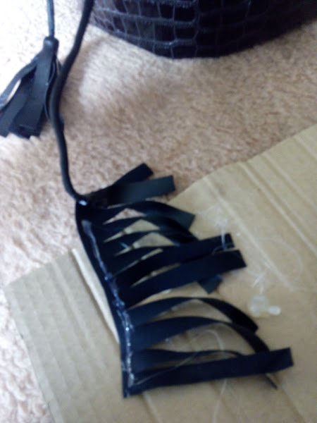 Pasamos el cordón de zapatos por los agujeros o bien le ponemos un nudo que no se vaya a escapar el cordón o bien le hacemos un fleco como le he hecho yo.