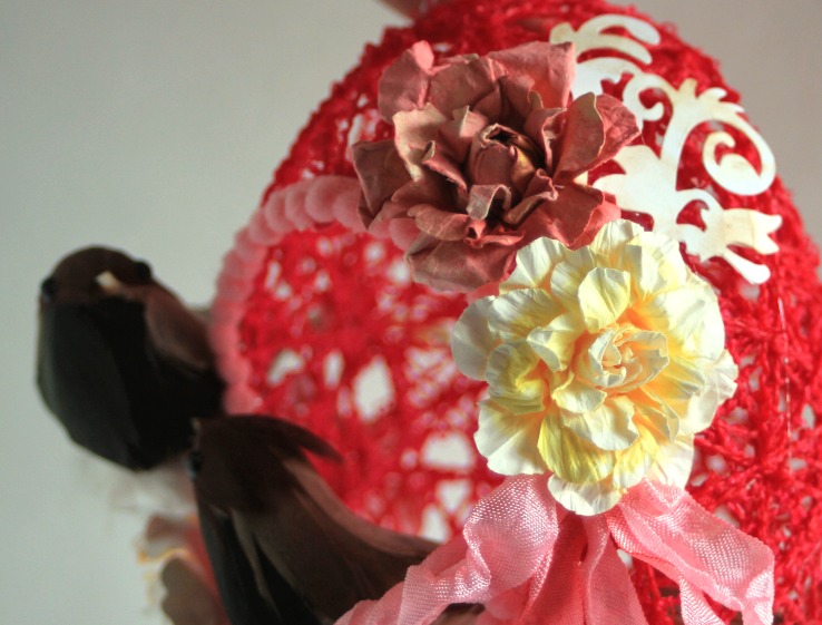 Todo lo pegué con silicona caliente. Hay que hacer una bonita composición, para que no quede recargado el peso para sólo un lado porque dificultaría colgar el huevo
