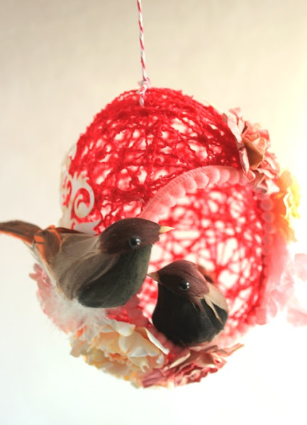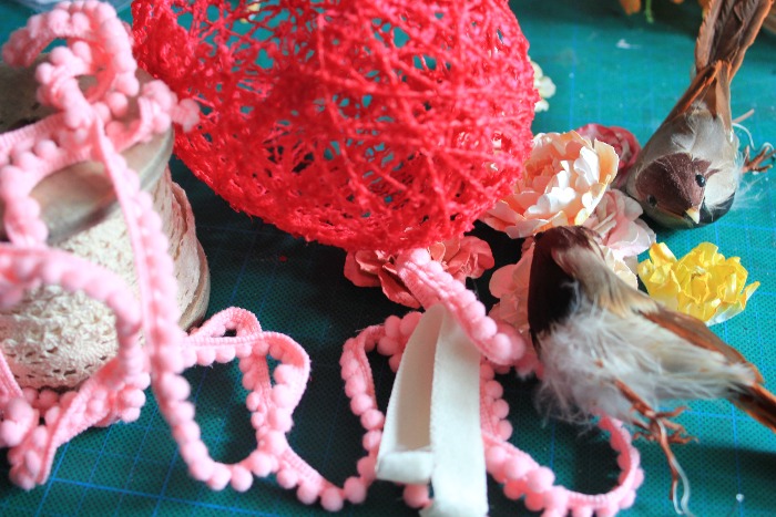 Le abres una "ventana" con unas tijeras y buscas qué cosas tienes por ahí... yo encontré un encaje con pompones minis, dos pájaritos, flores...