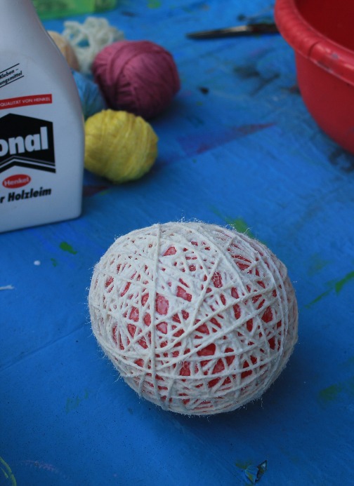 Con la cuerda bien empapada en el pegante debes ir envolviendo tu globo, dándole vueltas por todo lado, cuidando de que no queden partes con menos cuerda, ésto hará que hayan partes menos resistentes. (lo digo porque me pasó a mi!)
