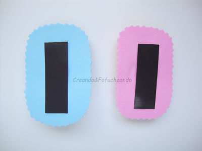 En la parte plana de la bolita no pegamos nada,ya que la vamos a poner directamente sobre esa pieza de Goma eva de 5x8 que hemos elegido como fondo de nuestra manualidad: celeste para niño y rosita para niña,y que he recortado con tijeras de estas de formas chulas.