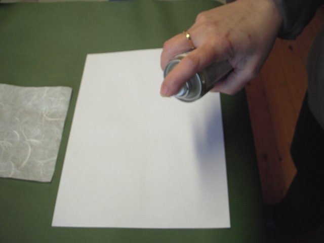 Rociaremos el folio ligeramente con el spray, y pegaremos suavemente el papel de arroz encima del folio.
