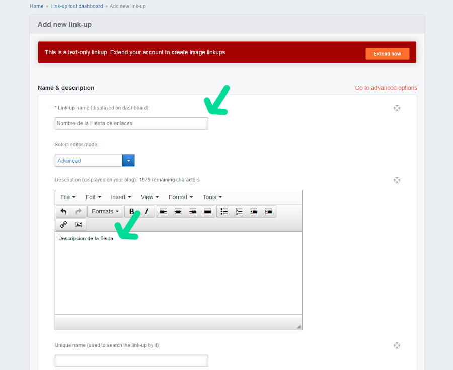 III- Nos aparecerá una nueva ventana donde podremos configurar la "fiesta de enlaces", escogemos el nombre que le queremos dar y la descripción breve del evento.