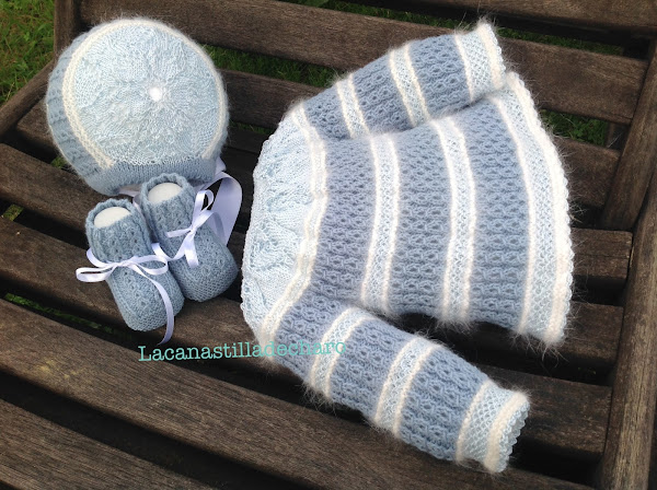 TOQUILLA BEBE LUKA (Punto garbanzo) Una toquilla para bebe a punto garbanzo y en pico. Tejida con calidad MIMO de Oso blanco y agujas nº 3 Cuerpo de la toquilla en pico a punto garbanzo, con un resul ...