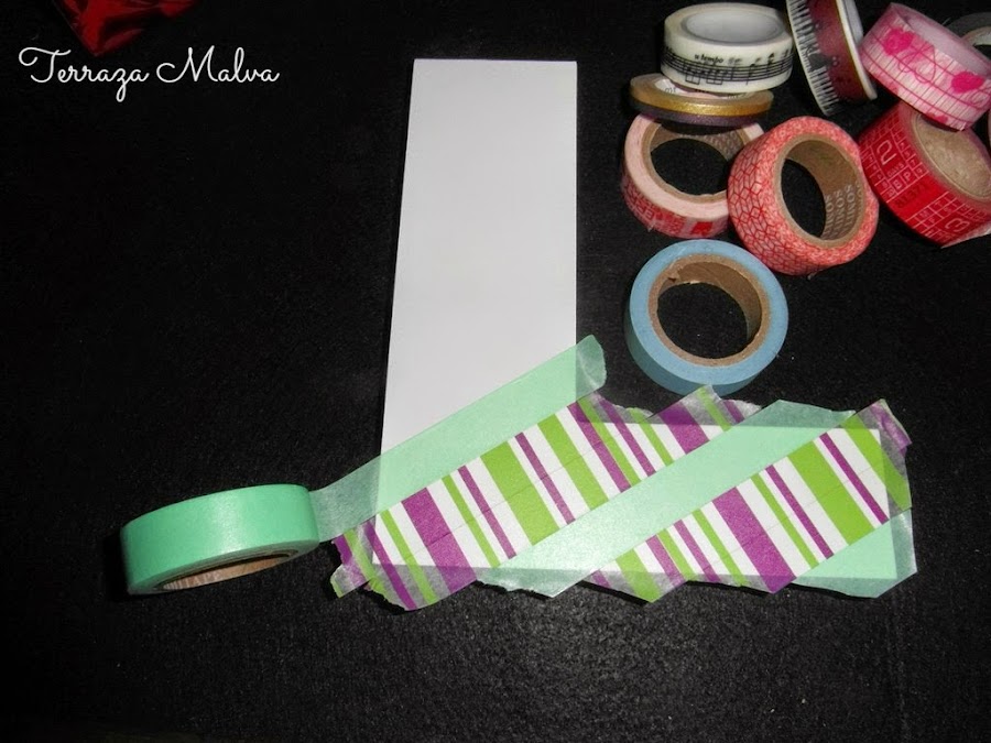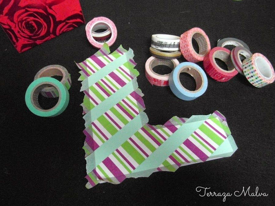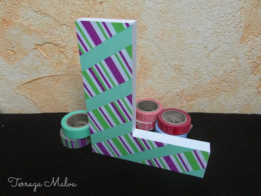 Se comienza por una de las superficies de la letra y se van aplicando tiras de washi con los motivos de nuestra elección. Se puede cubrir totalmente la superficie o situar la cinta cubriendo sólo una parte. Yo elegí dos cintas distintas, una lisa y otra rallada y además las situé siguiendo un patrón inclinado. La cinta ha de sobresalir un poco de la letra y en esta fase se puede cortar con los dedos.